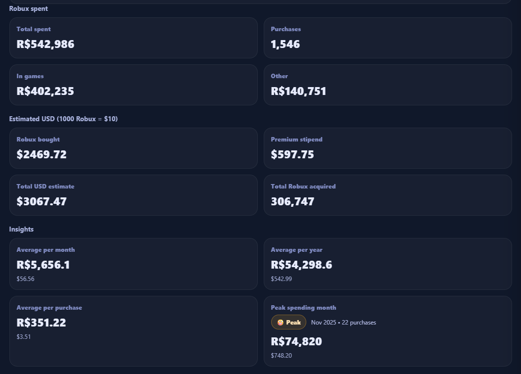 An Electron desktop app that tracks Robux inflow, outflow, and current balance, with charts and spending insights.